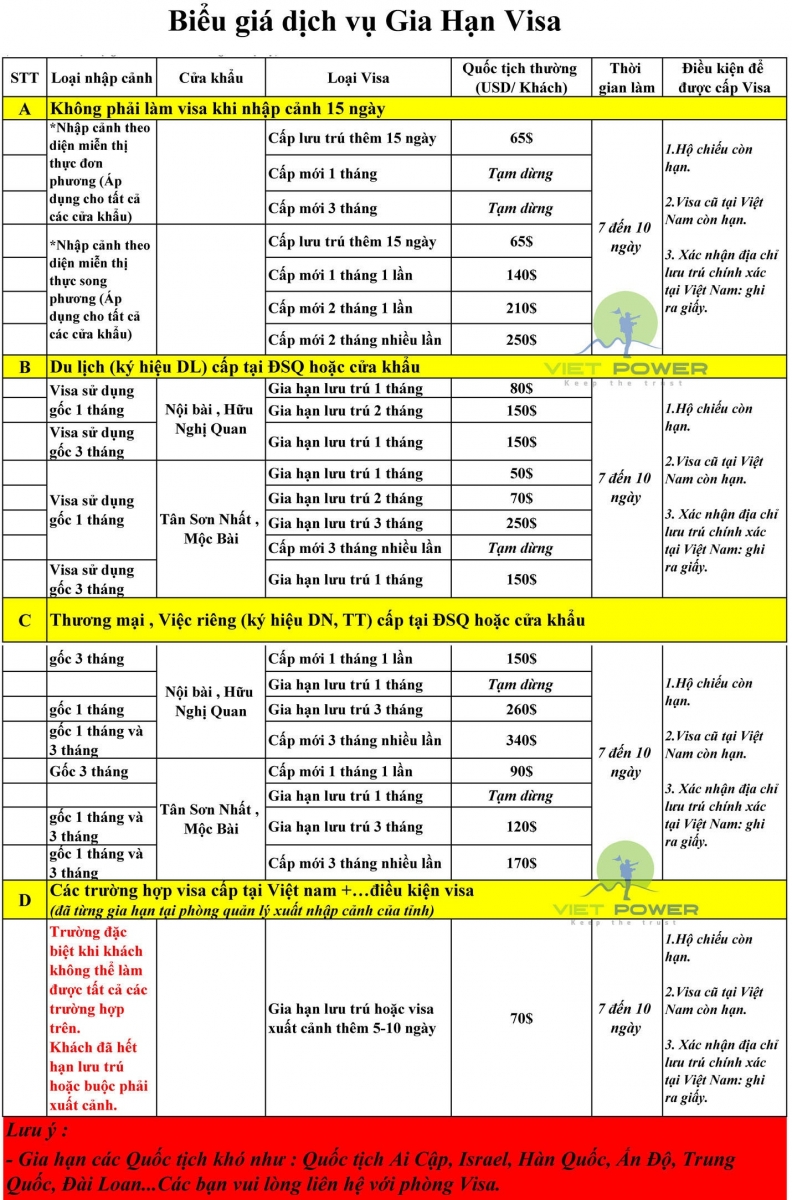 Bảng giá gia hạn visa của cục xuất nhập cảnh