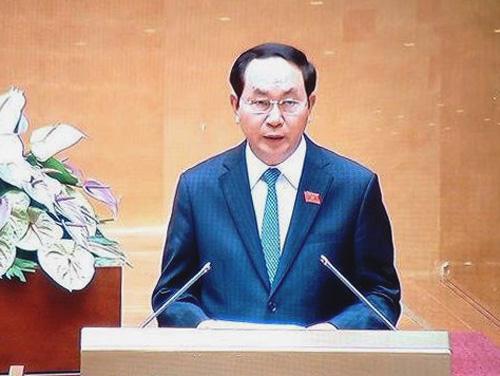 Chủ tịch nước Trần Đại Quang trình bày trước QH sáng 4-4 - Ảnh chụp qua màn hình