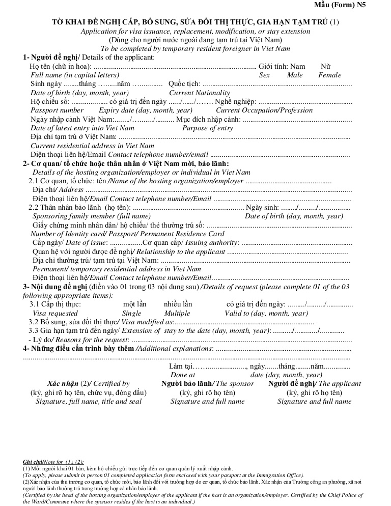 Mẫu gia hạn visa tại Việt Nam N5 các bạn có thể tải ở đây: Mẫu N5